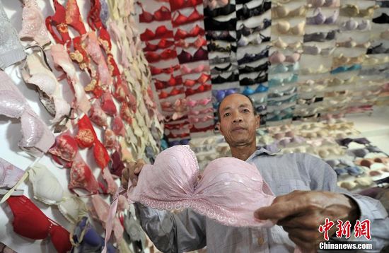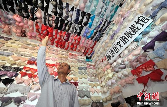 [國內(nèi)新聞]4月21日,海南省三亞市崖城鎮(zhèn)的陳清祖花費(fèi)20年時(shí)間收集5000余件文胸,在一間棟不起眼小房間的墻壁上、天花板上掛滿了各式各樣的女性文胸,數(shù)量多達(dá)5000余件,而這些令人目不暇接的“藏品”來自全國30多所高校的女生。據(jù)陳清祖介紹,他的夢想是將來打造一間文胸收藏館,通過展示內(nèi)衣,提高全社會(huì)對(duì)女性乳房健康的關(guān)注度。圖為陳清祖展示他的“特別藏品”。