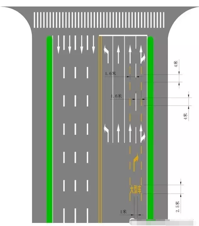 將公交車等大型車右轉(zhuǎn)的車道向道路中心移動半個車道(此處樹枝高度已達到公交車等大型車通行要求),右側(cè)第一與第二條存儲車道中間用黃虛線施劃專供大型車右轉(zhuǎn)的車道,并施劃右轉(zhuǎn)箭頭(見示意圖);將右側(cè)第一條右轉(zhuǎn)車道改為直加右車道,右側(cè)第二條直加右車道改為直行車道,同時配套修改車道指示標志。