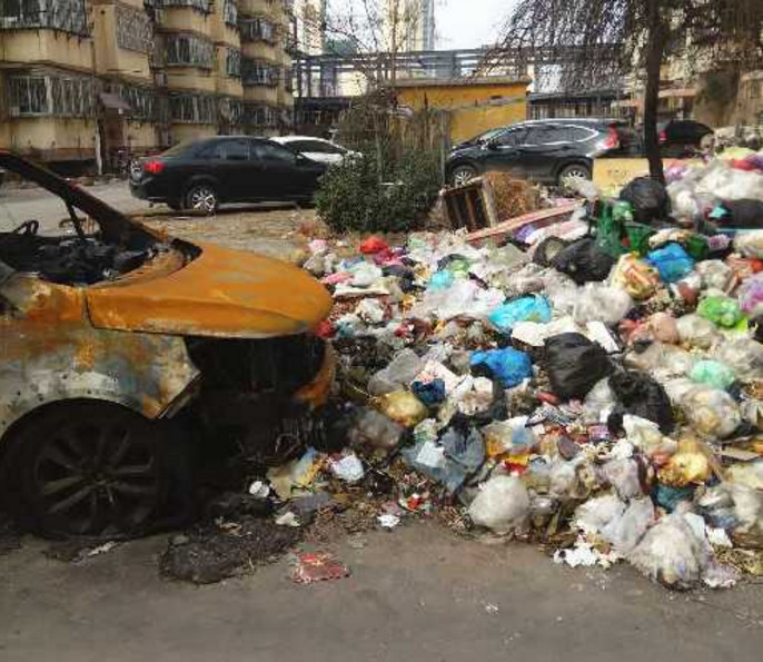 2月28日上午,記者來到農(nóng)機小區(qū),一進小區(qū)大門就看到了堆積在7號樓前的巨型垃圾山,原來的藍色垃圾桶早已被埋進“山”中,垃圾山旁還停著一輛被燒得面目全非的小轎車。